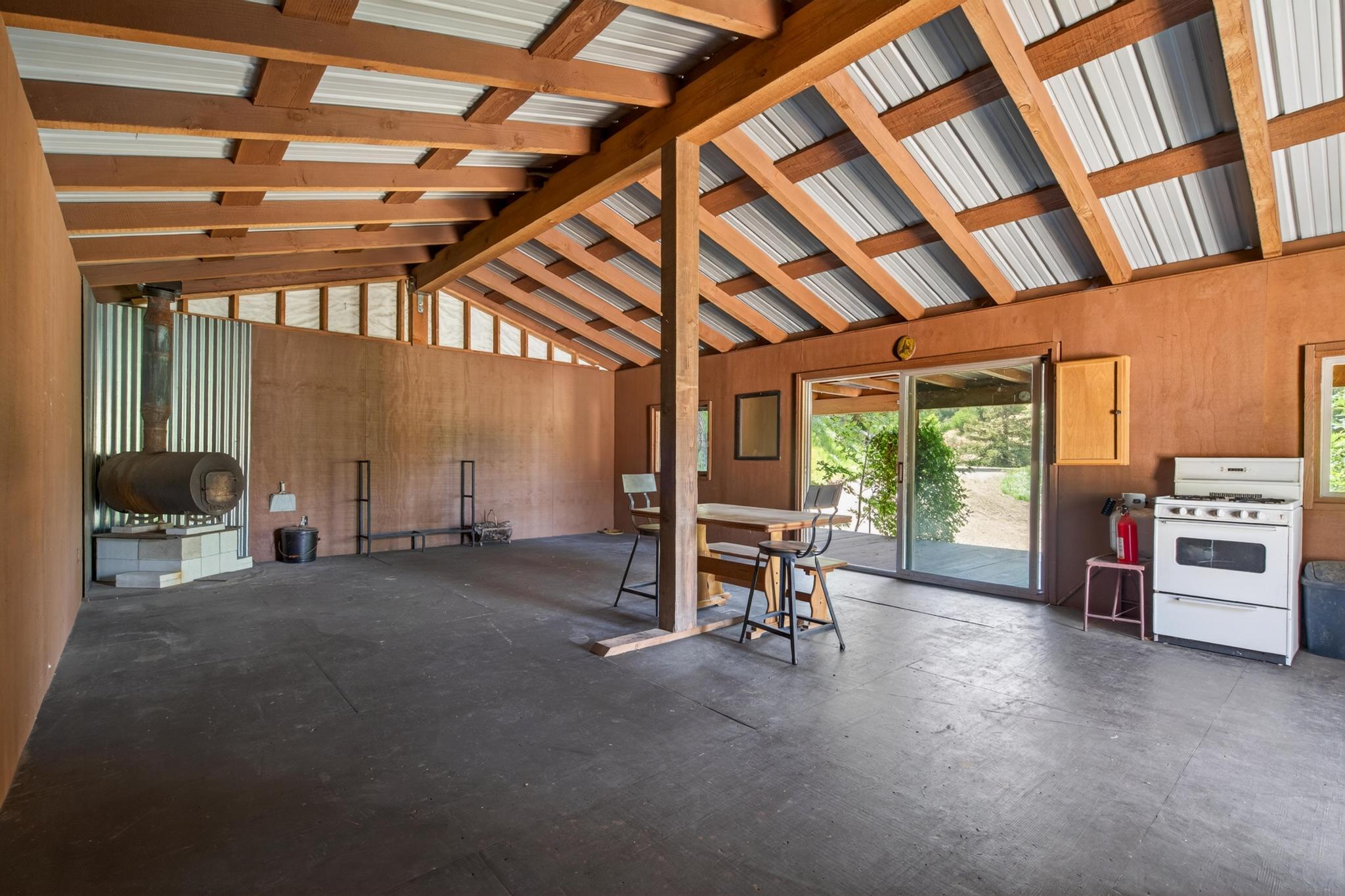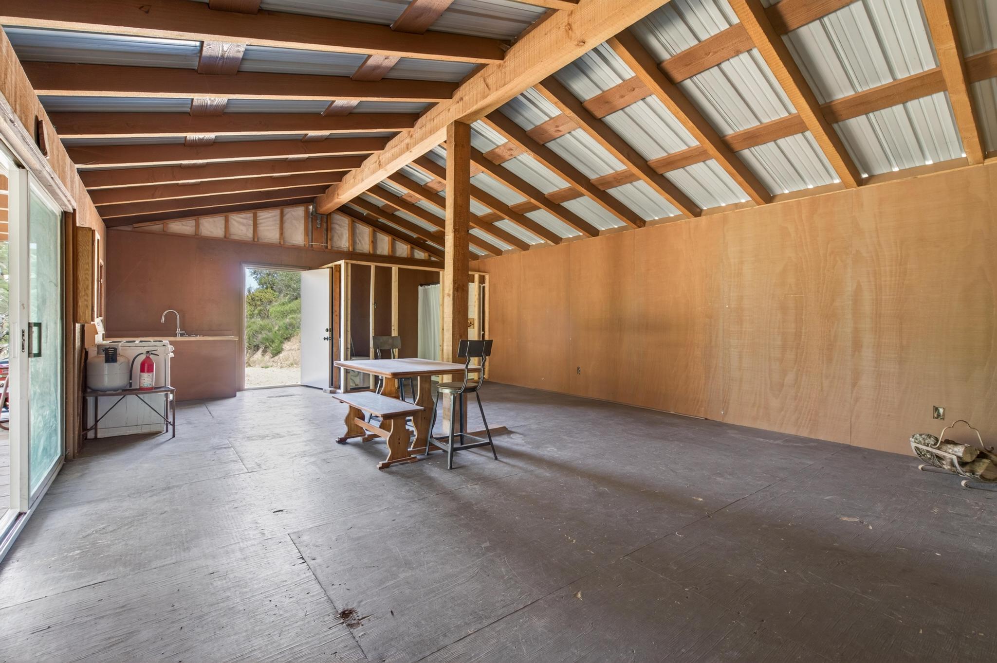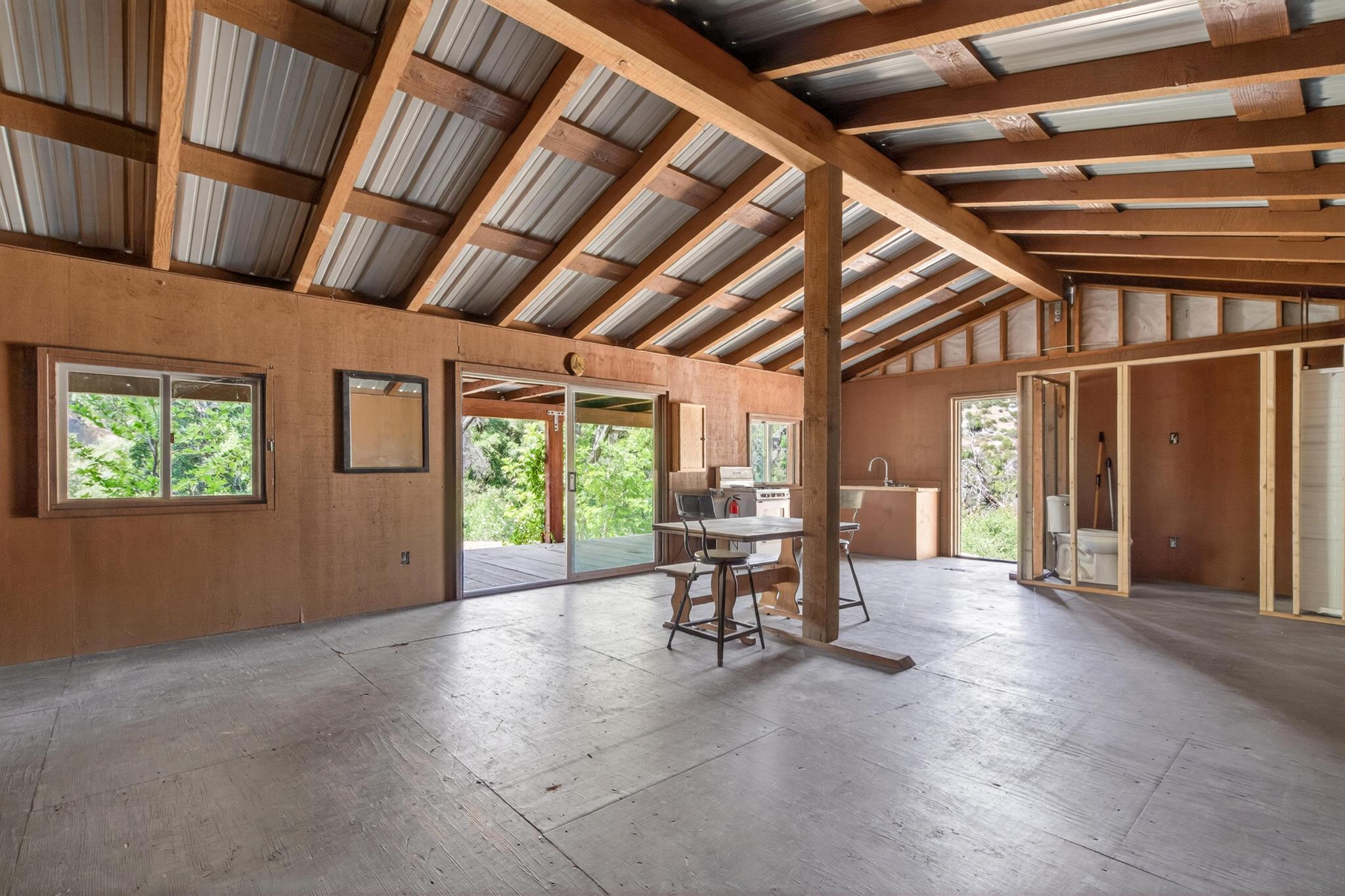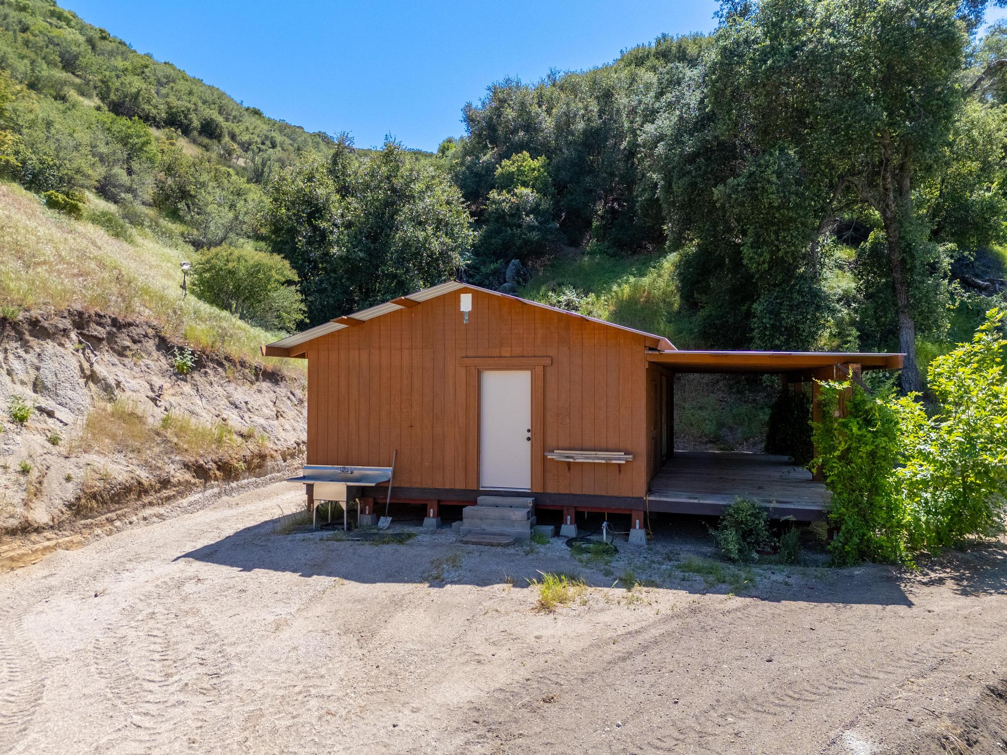 A rustic ~640 sq ft studio cabin with a wood stove provides a comfortable basecamp setting. Bathroom infrastructure is in place but currently non-operational. The cabin is complemented by an approximately 320 sq ft covered porch, creating a functional and inviting retreat in its present form.