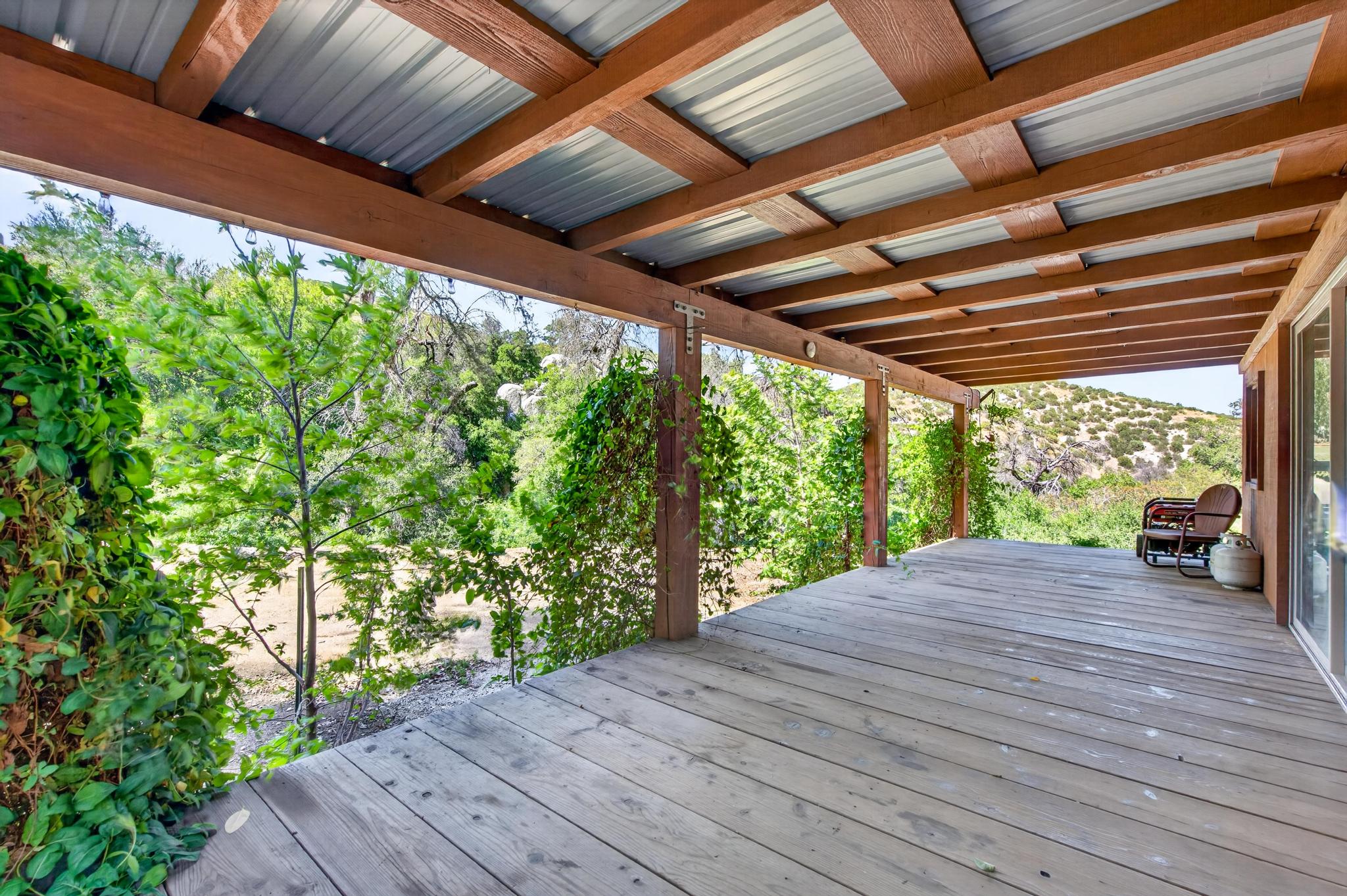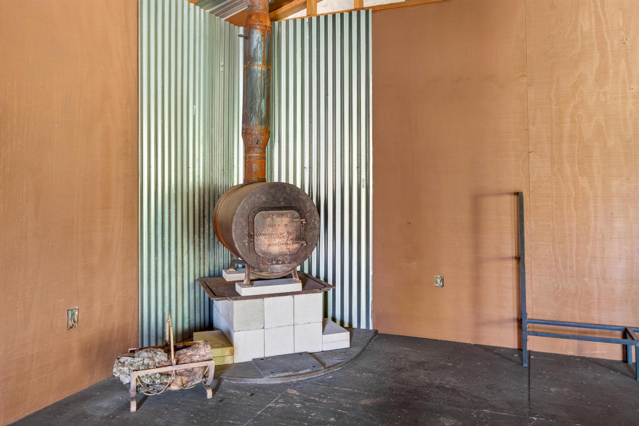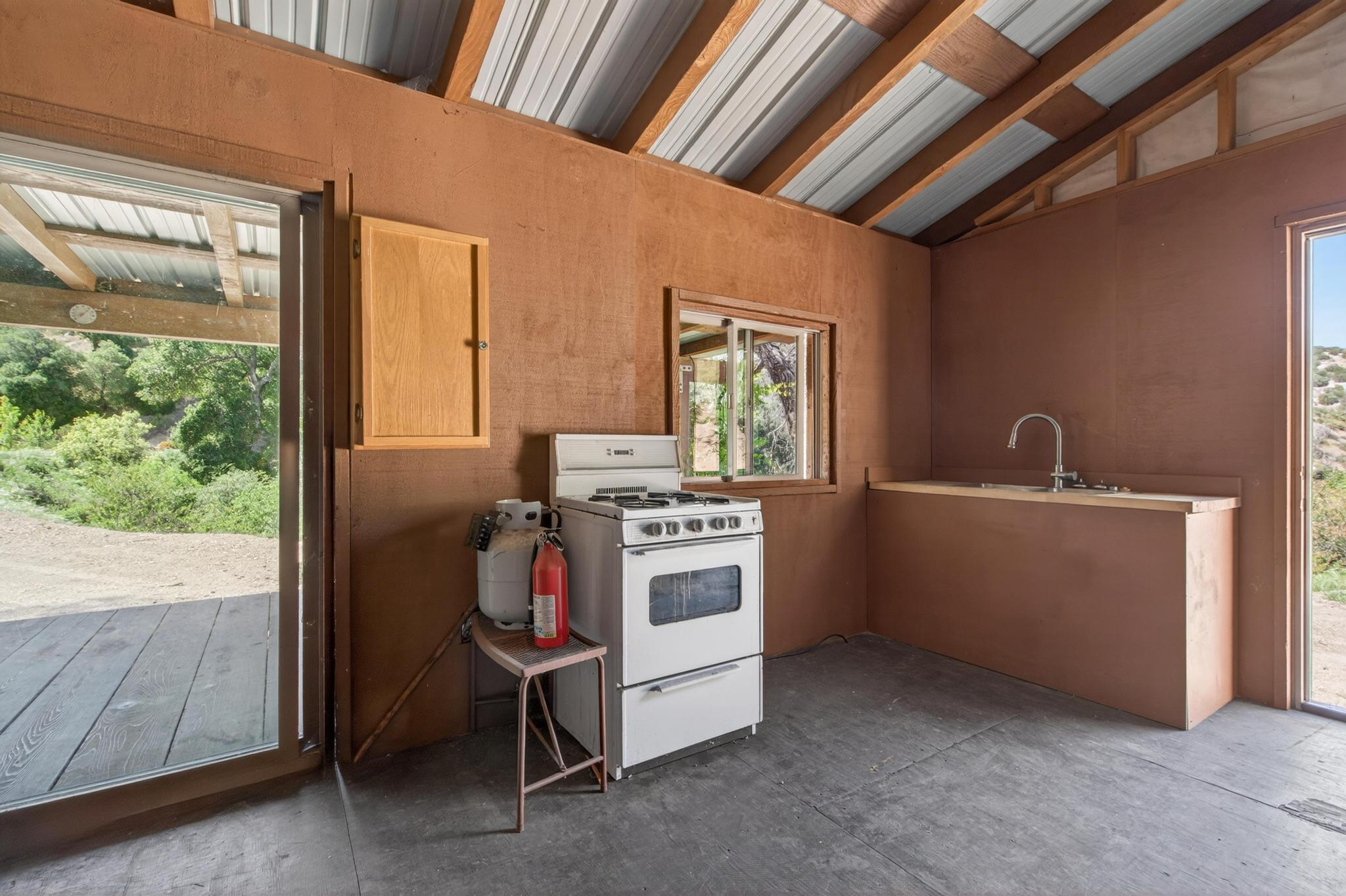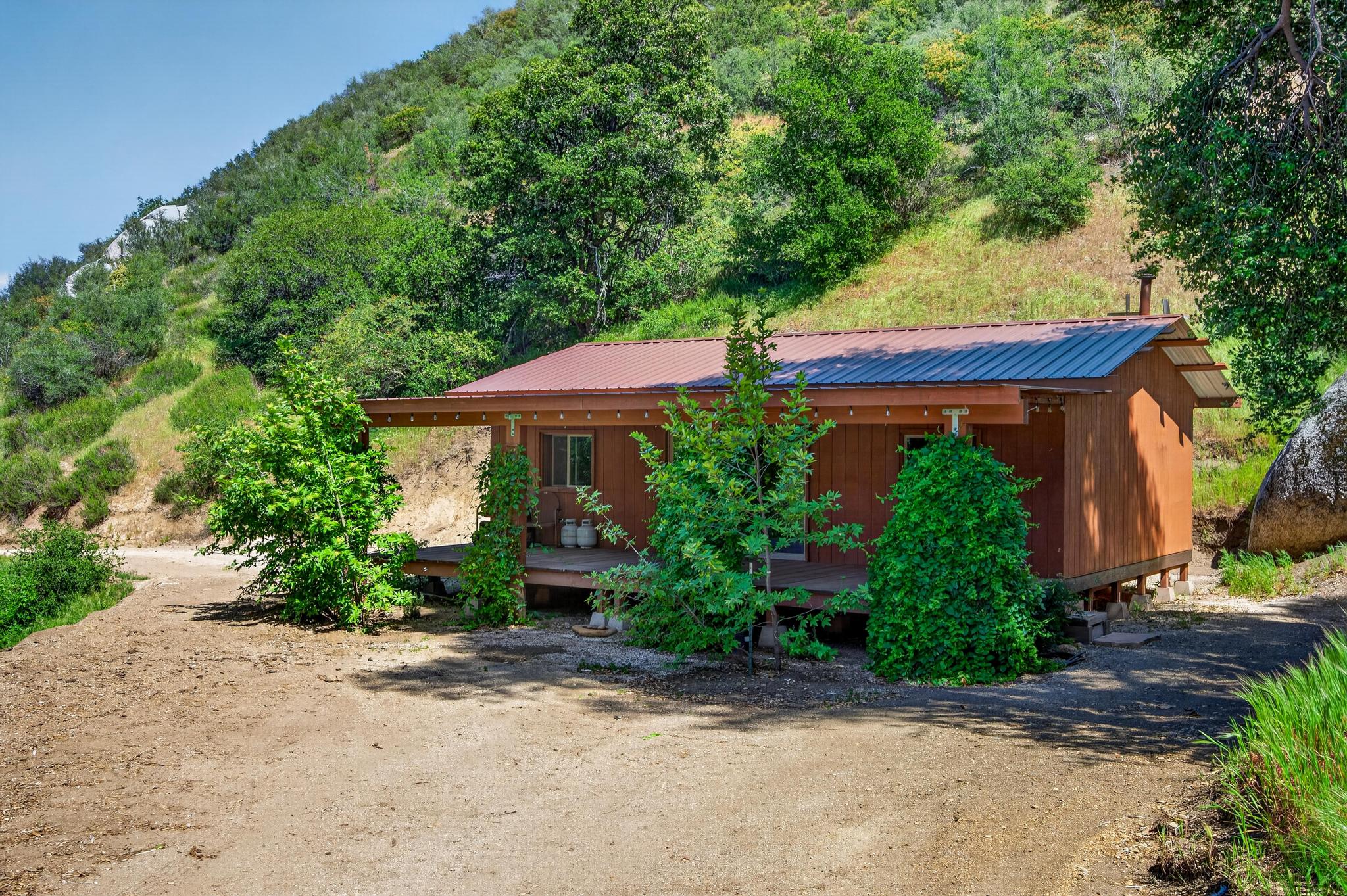 A rustic ~640 sq ft studio cabin with a wood stove provides a comfortable basecamp setting. Bathroom infrastructure is in place but currently non-operational. The cabin is complemented by an approximately 320 sq ft covered porch, creating a functional and inviting retreat in its present form.