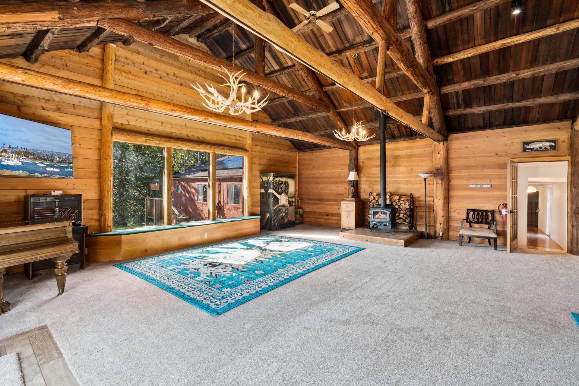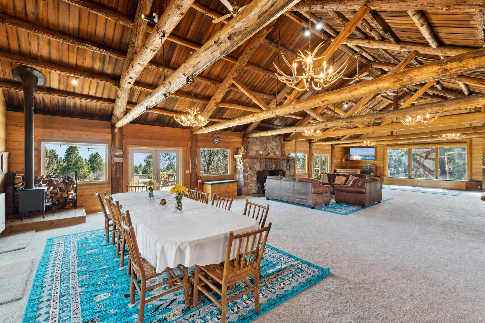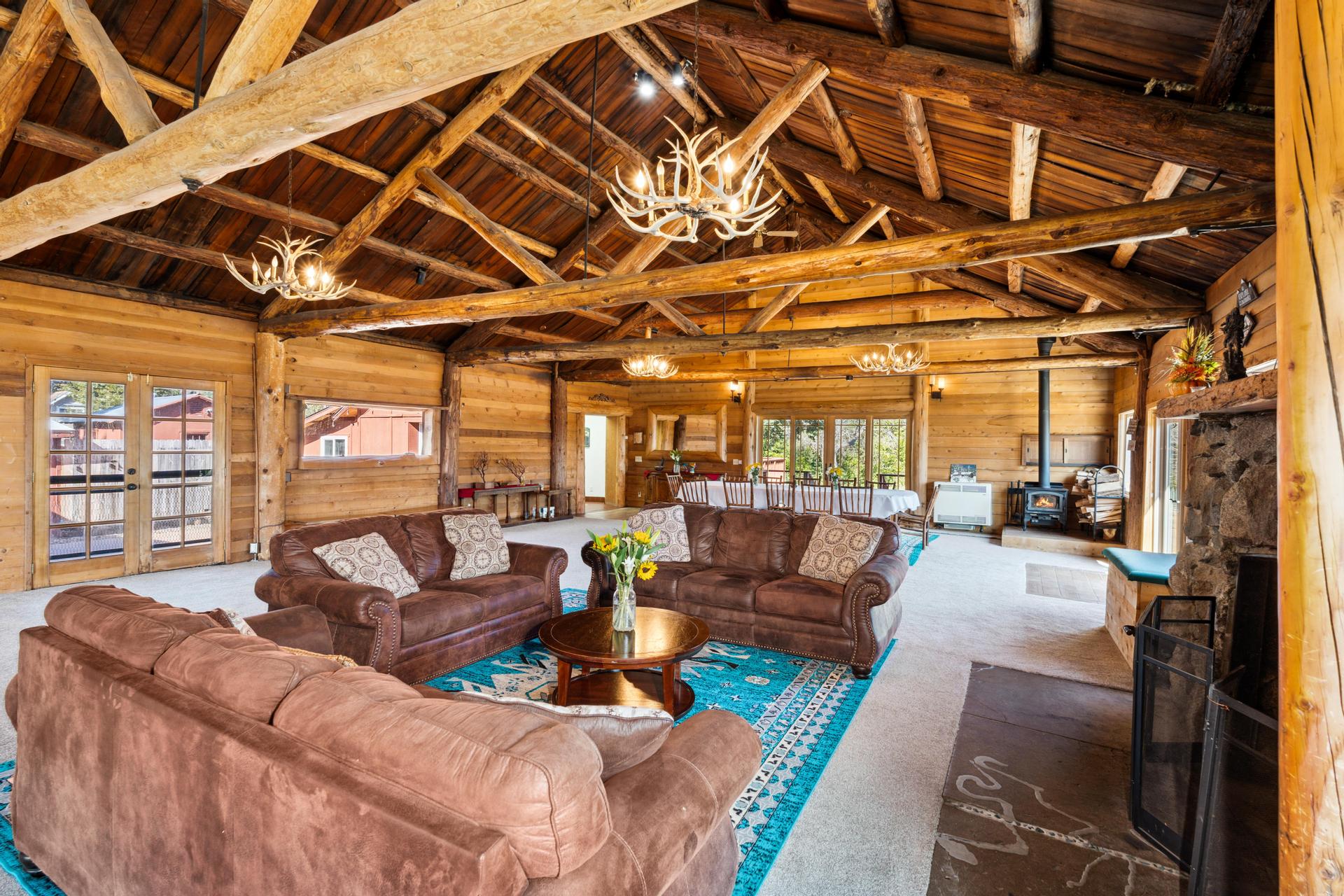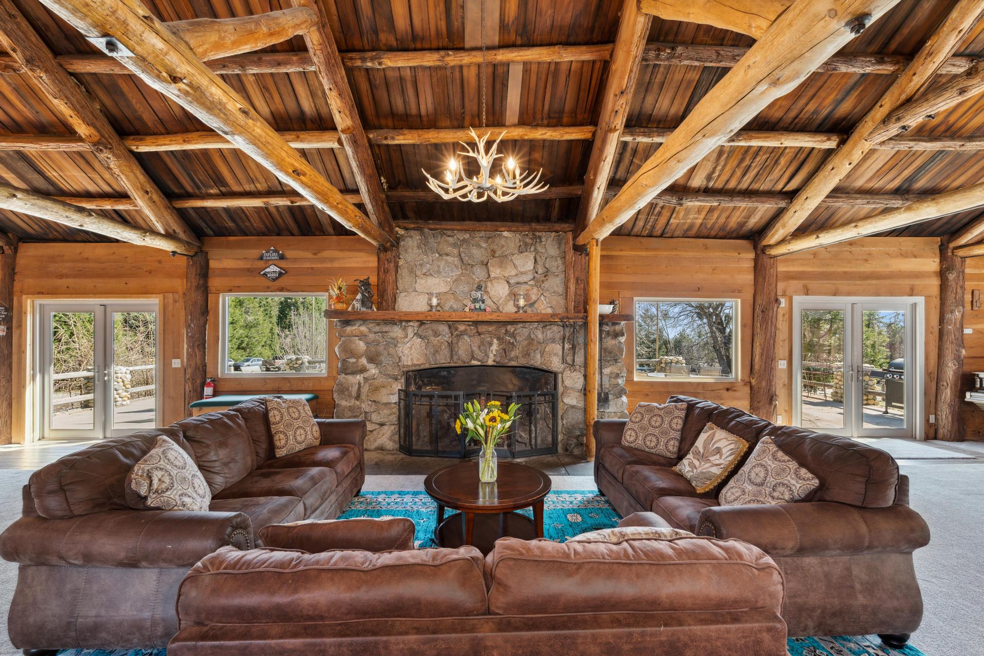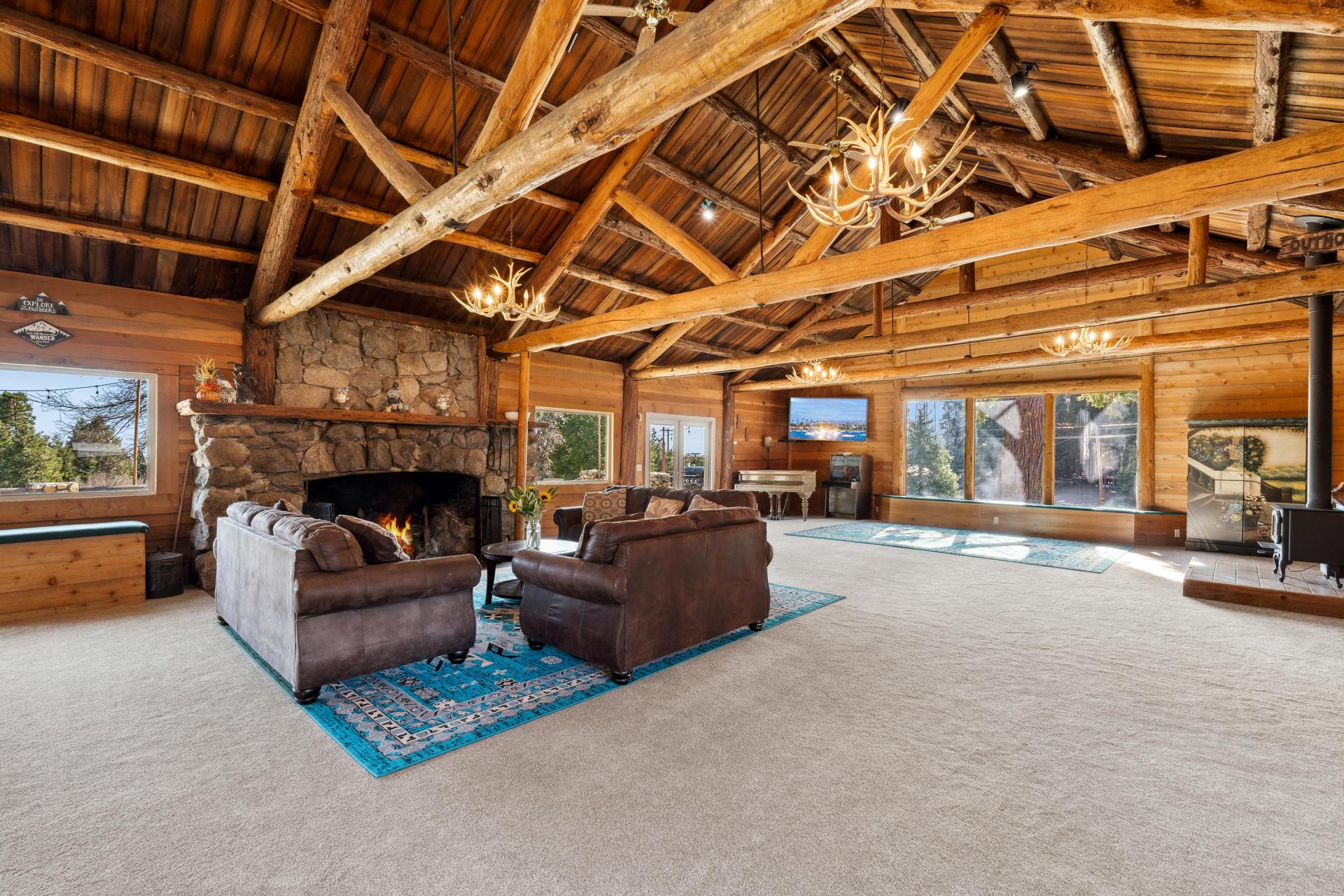 Grand 1,800± sf great room with soaring log-beam ceilings and a dramatic stone fireplace—the heart of The Lodge.