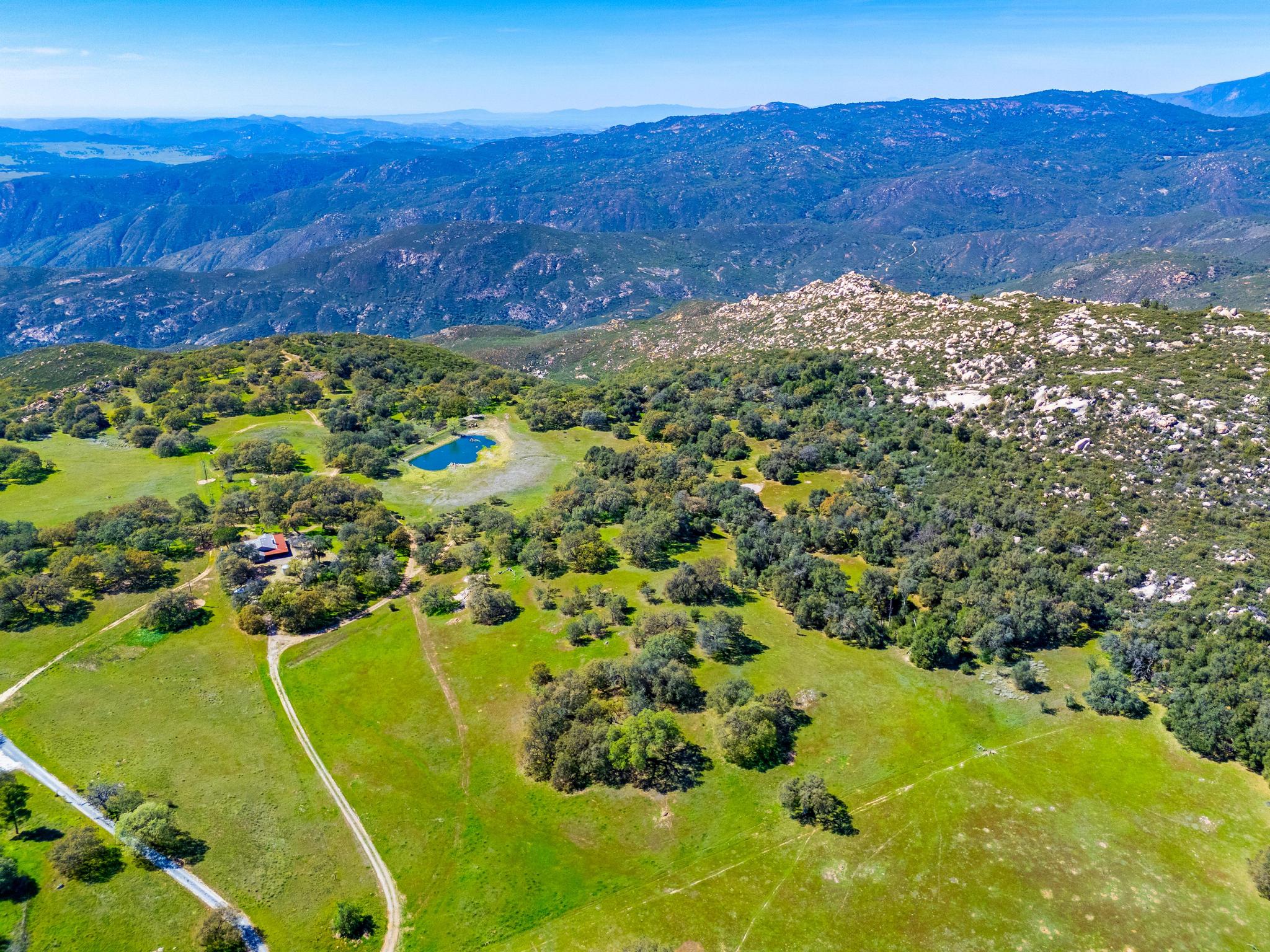 Here, time slows. The landscape stretches into a living canvas of rolling meadows, wildflowers, and granite outcroppings—offering several awe-inspiring vantage points over Pamo Valley, Palomar Mountain, and the legendary Rancho Guejito. Well-established trails wind through open meadows and shady groves of native oak and manzanita, leading to a serene pond and improved open air gathering space – perfect for personal camping, special occasions and outdoor recreation. Pick handfuls of wild blackberries that flourish along the trails—sun-warmed and sweet. As the sun dips below the horizon, the sky transforms into a masterpiece of color, a reminder of nature’s sacred balance.