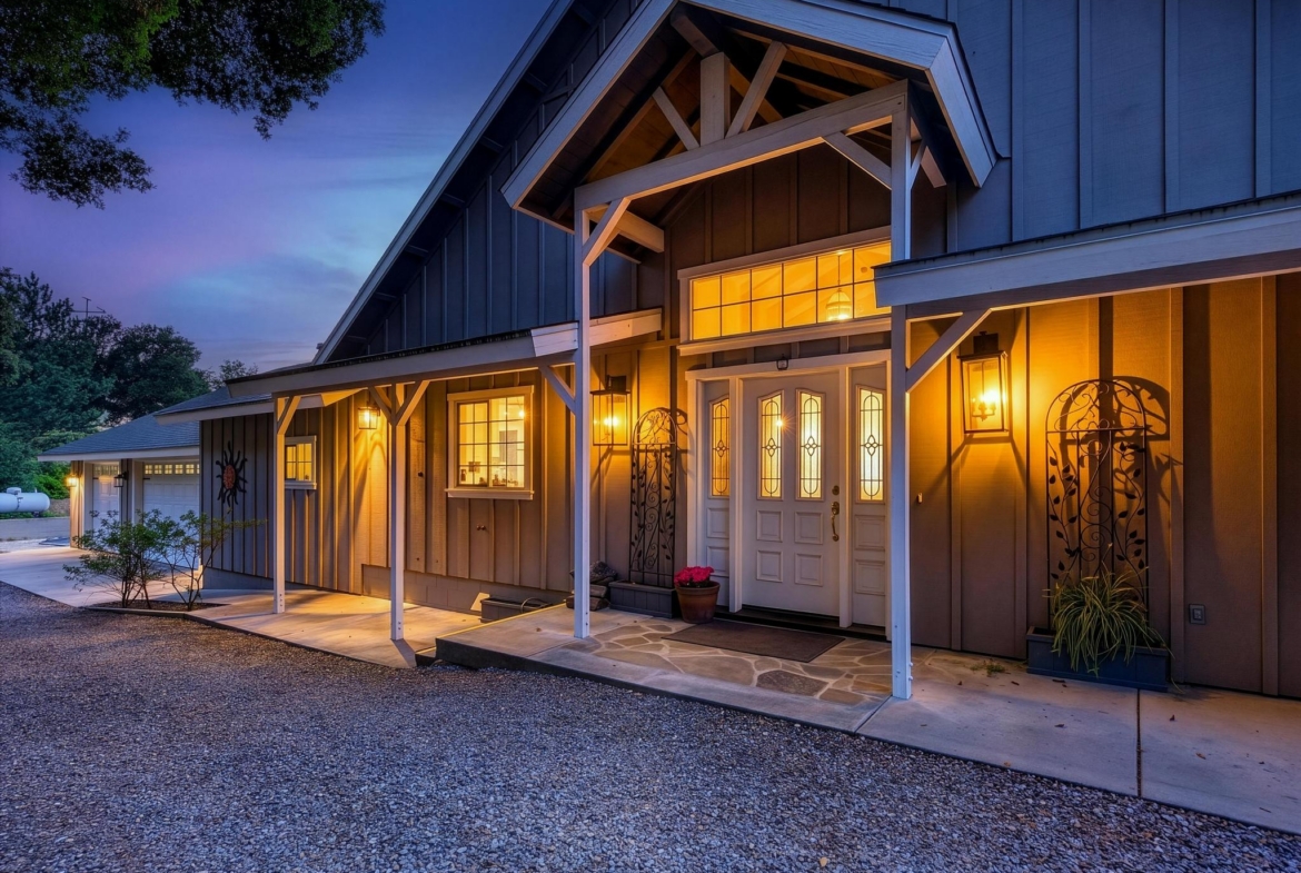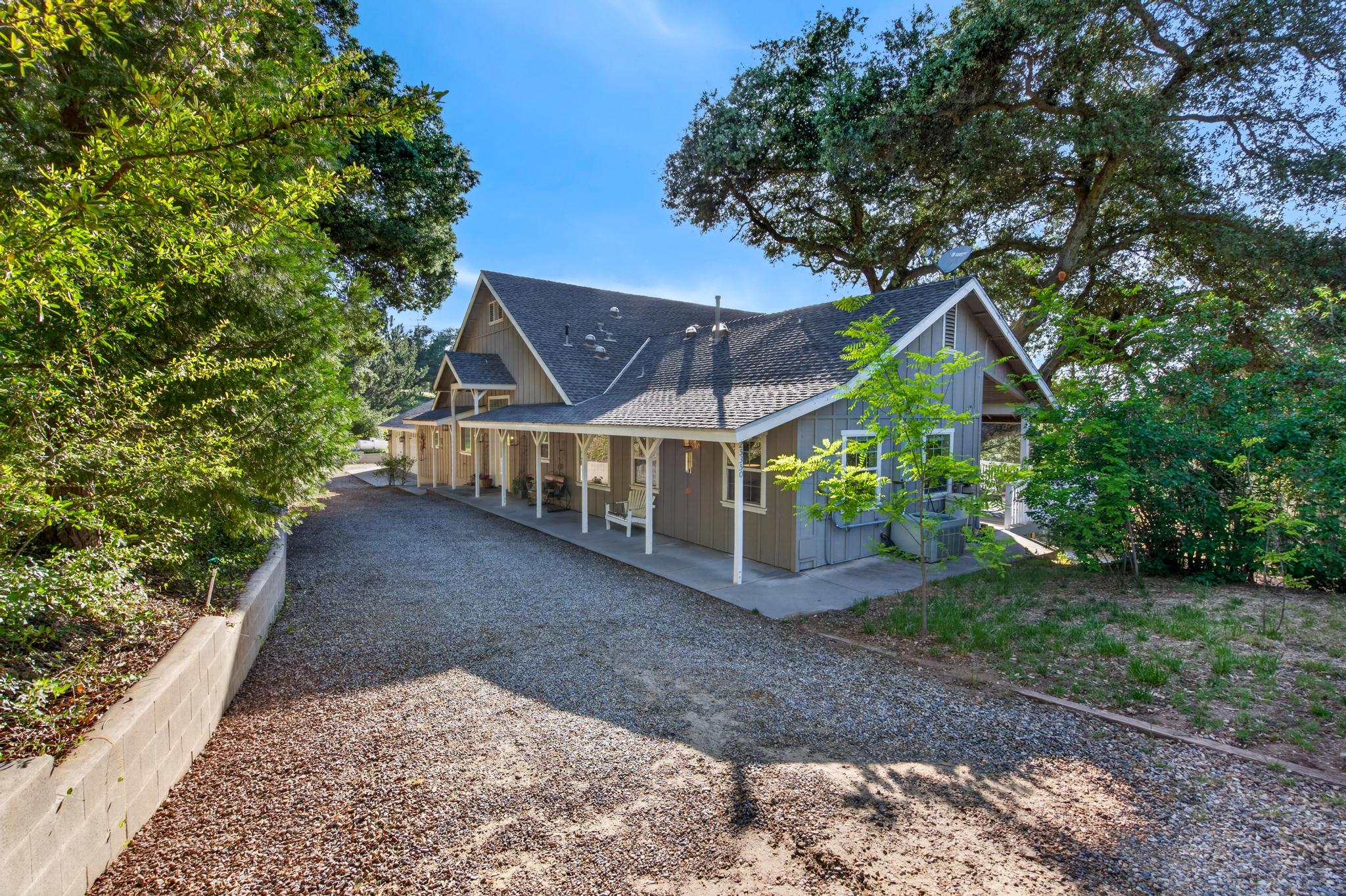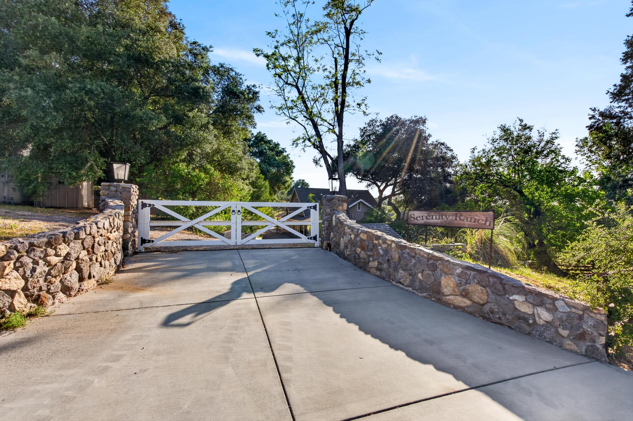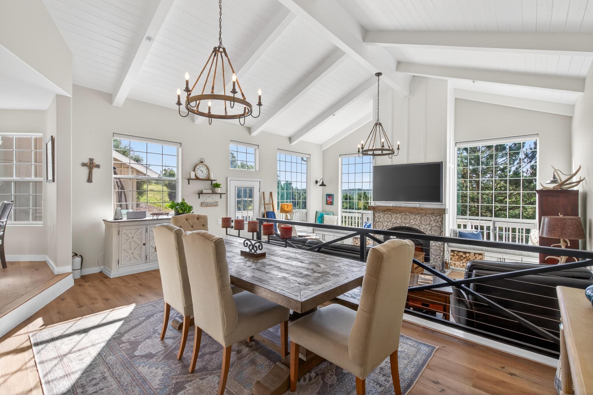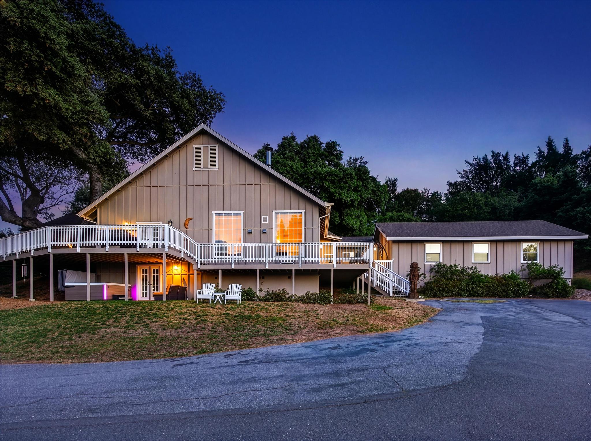 A gated entry and gently winding drive welcome you into a private, fully fenced 8.15-acre estate where rolling terrain and mature oaks create a landscape that is both peaceful and inspiring. At the heart of the property is a thoughtfully remodeled 2,135 square foot ranch home featuring three bedrooms, an optional fourth bedroom or flexible space, and two and a half baths. The home seamlessly blends modern farmhouse style with timeless character, where vaulted wood beam ceilings, adobe walls, numerous skylights, and expansive windows fill the interior with natural light while framing sweeping westerly views. The open floor plan is designed for both comfortable living and effortless entertaining, with many rooms opening directly to an expansive wraparound deck that extends the living space outdoors.