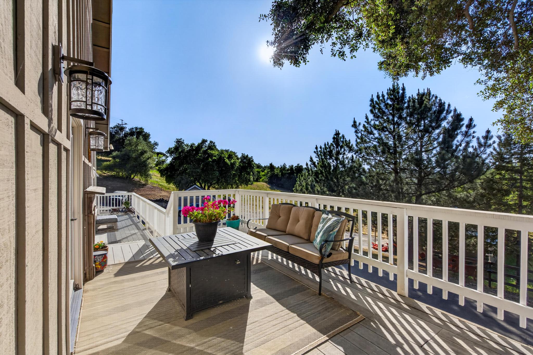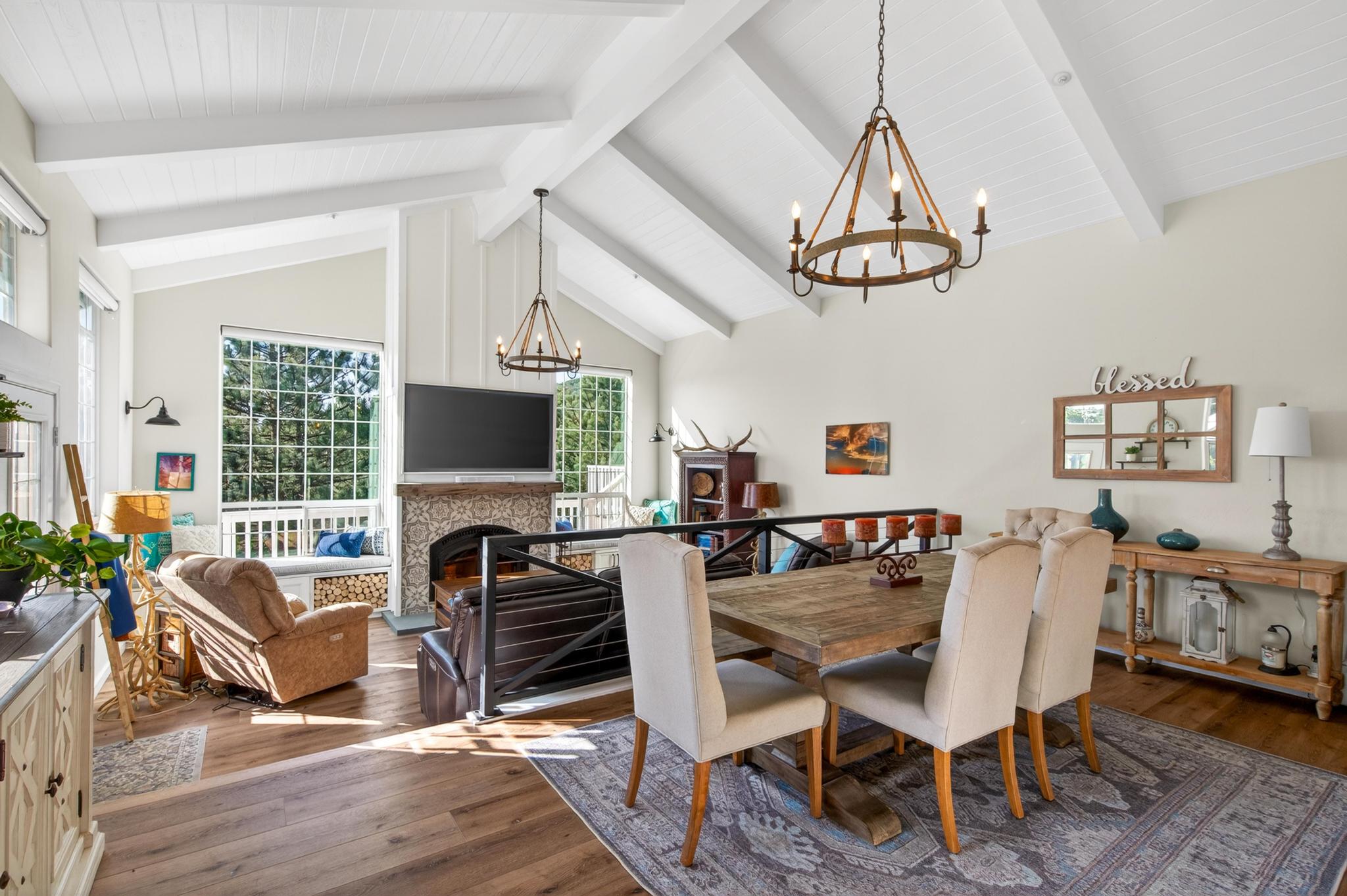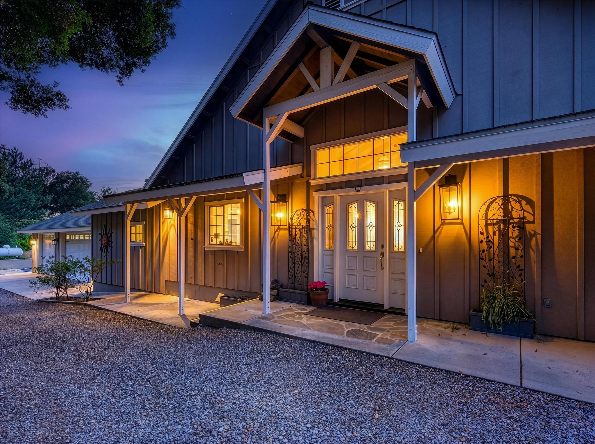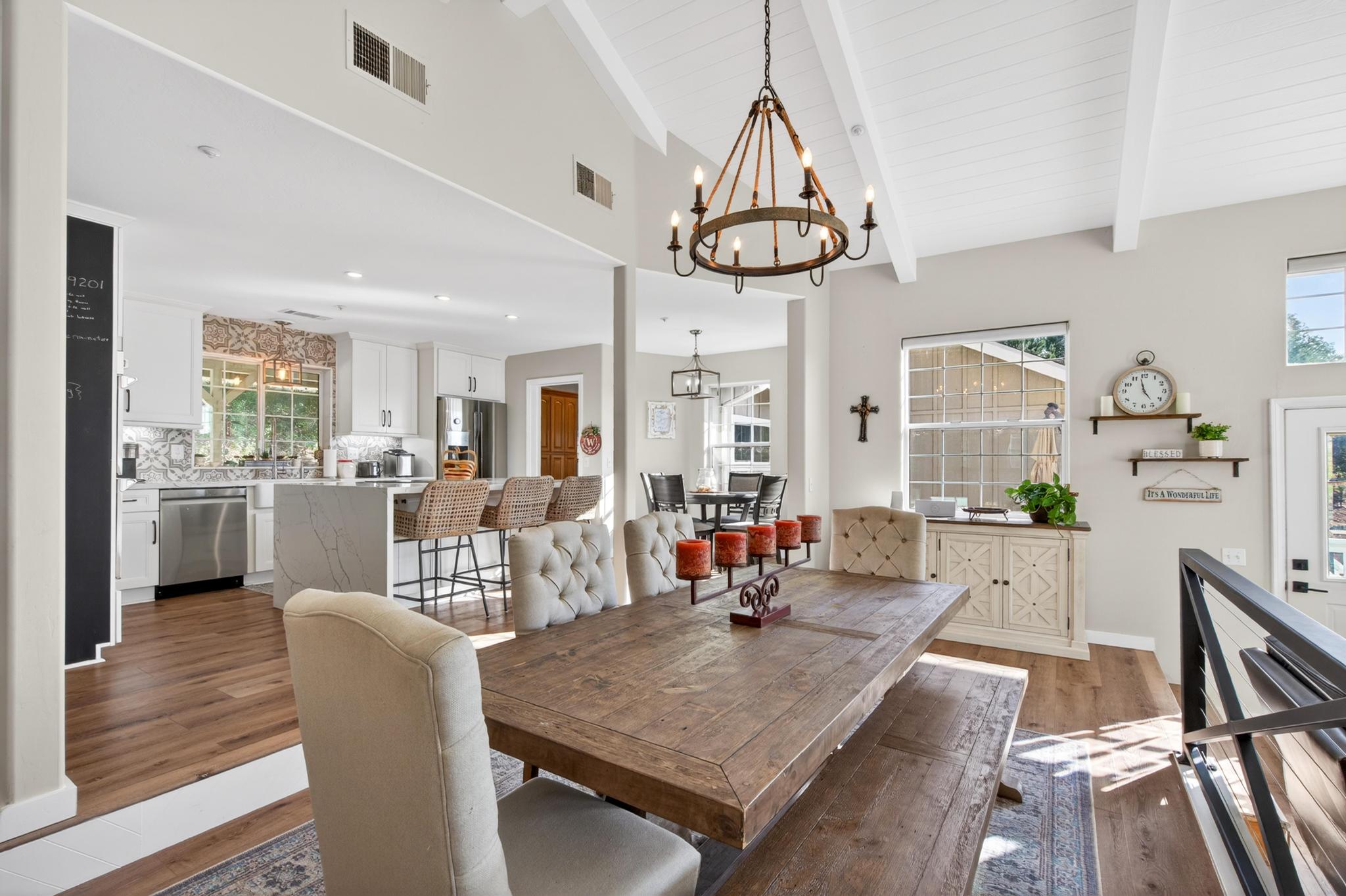 A gated entry and gently winding drive welcome you into a private, fully fenced 8.15-acre estate where rolling terrain and mature oaks create a landscape that is both peaceful and inspiring. At the heart of the property is a thoughtfully remodeled 2,135 square foot ranch home featuring three bedrooms, an optional fourth bedroom or flexible space, and two and a half baths. The home seamlessly blends modern farmhouse style with timeless character, where vaulted wood beam ceilings, adobe walls, numerous skylights, and expansive windows fill the interior with natural light while framing sweeping westerly views. The open floor plan is designed for both comfortable living and effortless entertaining, with many rooms opening directly to an expansive wraparound deck that extends the living space outdoors.