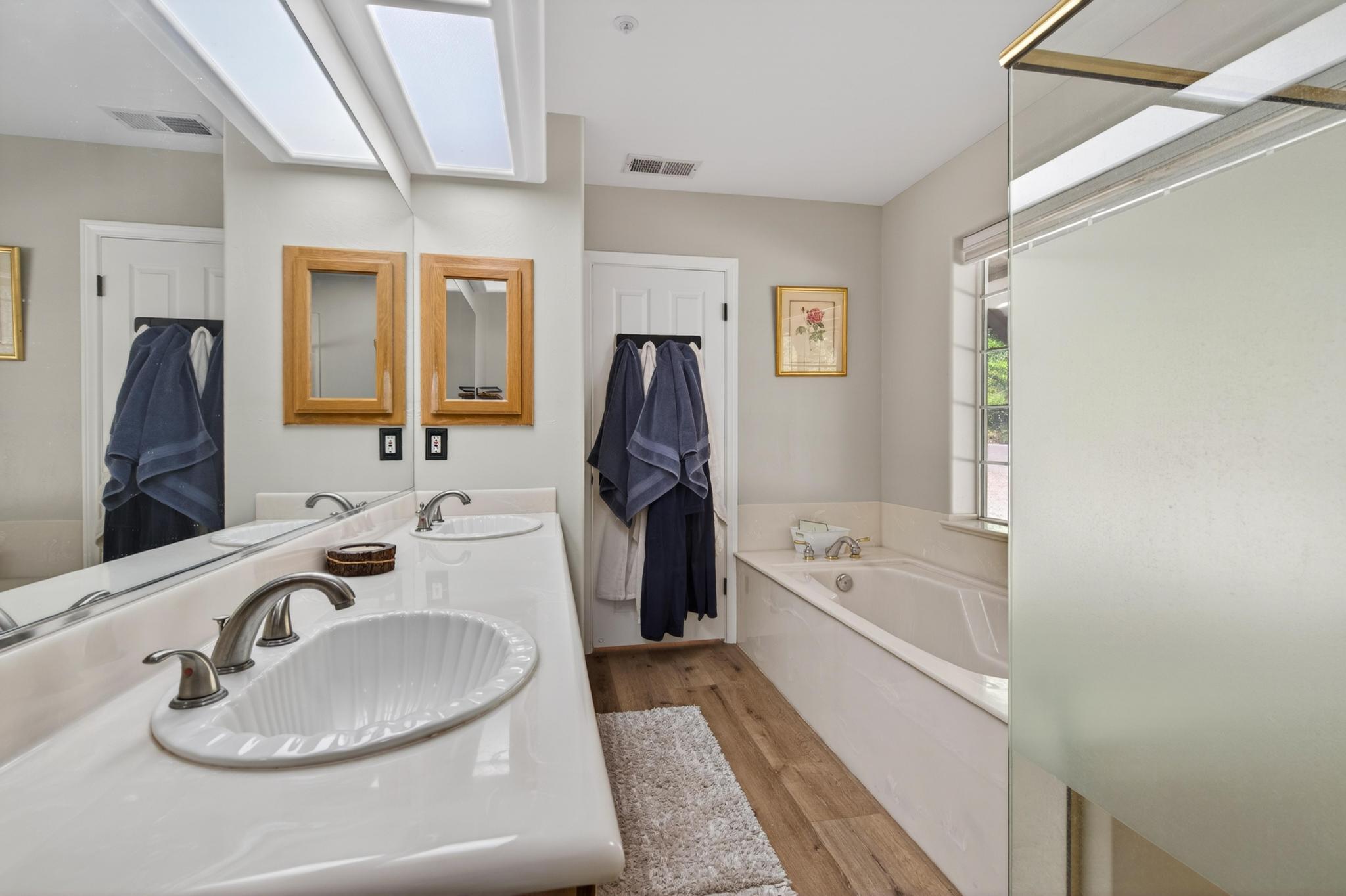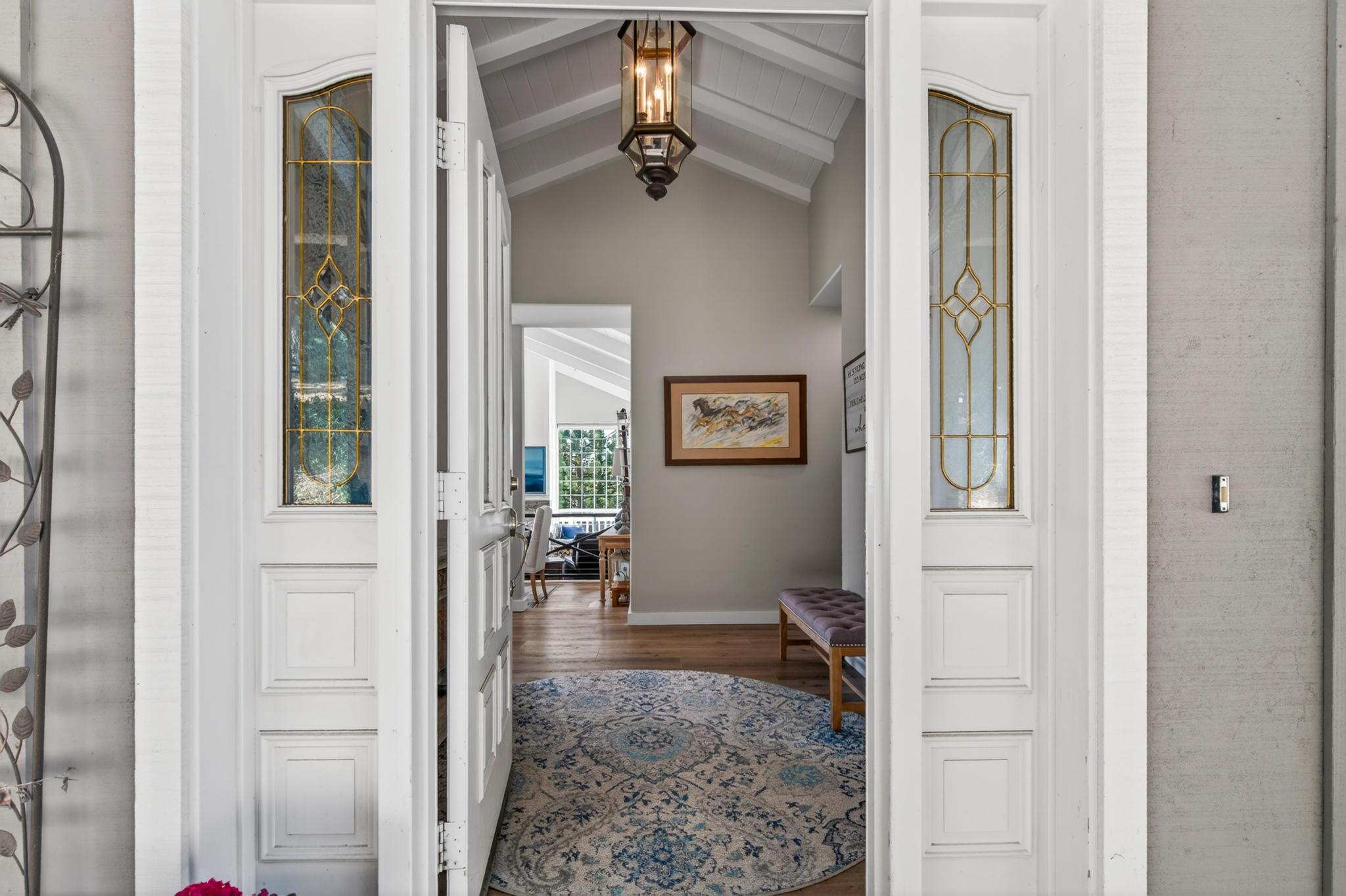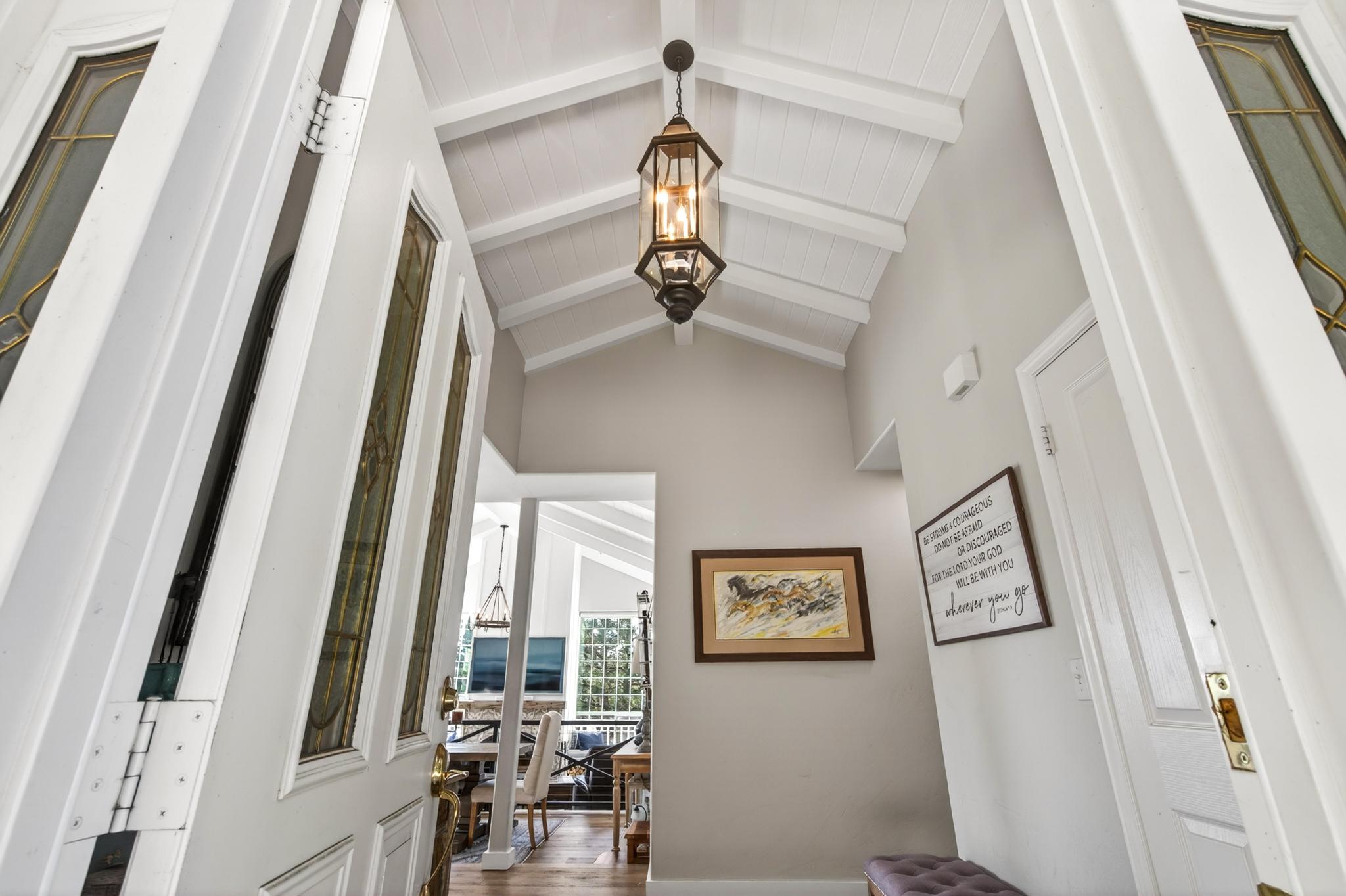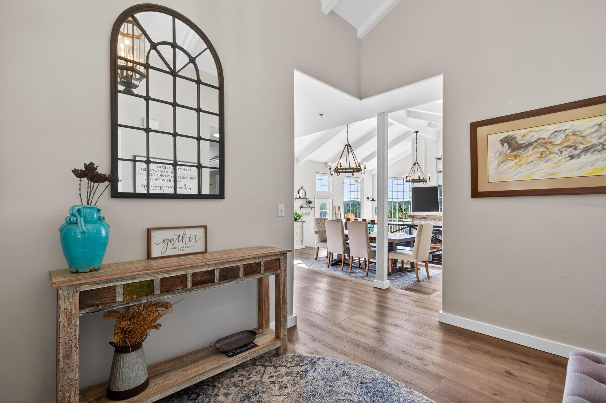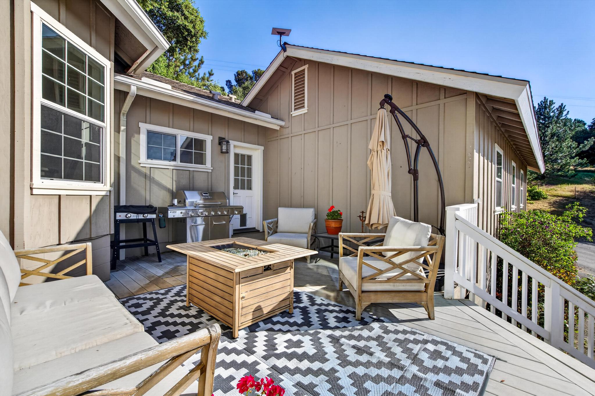 A gated entry and gently winding drive welcome you into a private, fully fenced 8.15-acre estate where rolling terrain and mature oaks create a landscape that is both peaceful and inspiring. At the heart of the property is a thoughtfully remodeled 2,135 square foot ranch home featuring three bedrooms, an optional fourth bedroom or flexible space, and two and a half baths. The home seamlessly blends modern farmhouse style with timeless character, where vaulted wood beam ceilings, adobe walls, numerous skylights, and expansive windows fill the interior with natural light while framing sweeping westerly views. The open floor plan is designed for both comfortable living and effortless entertaining, with many rooms opening directly to an expansive wraparound deck that extends the living space outdoors.