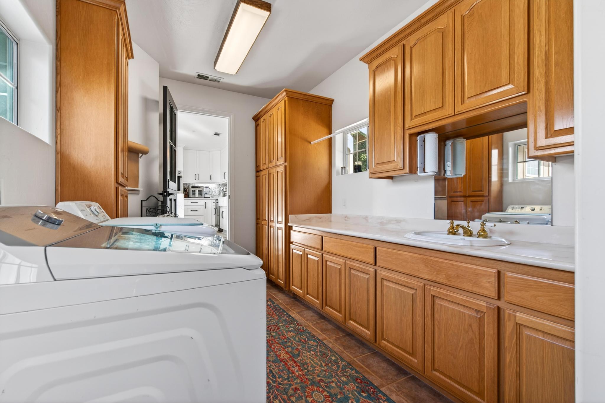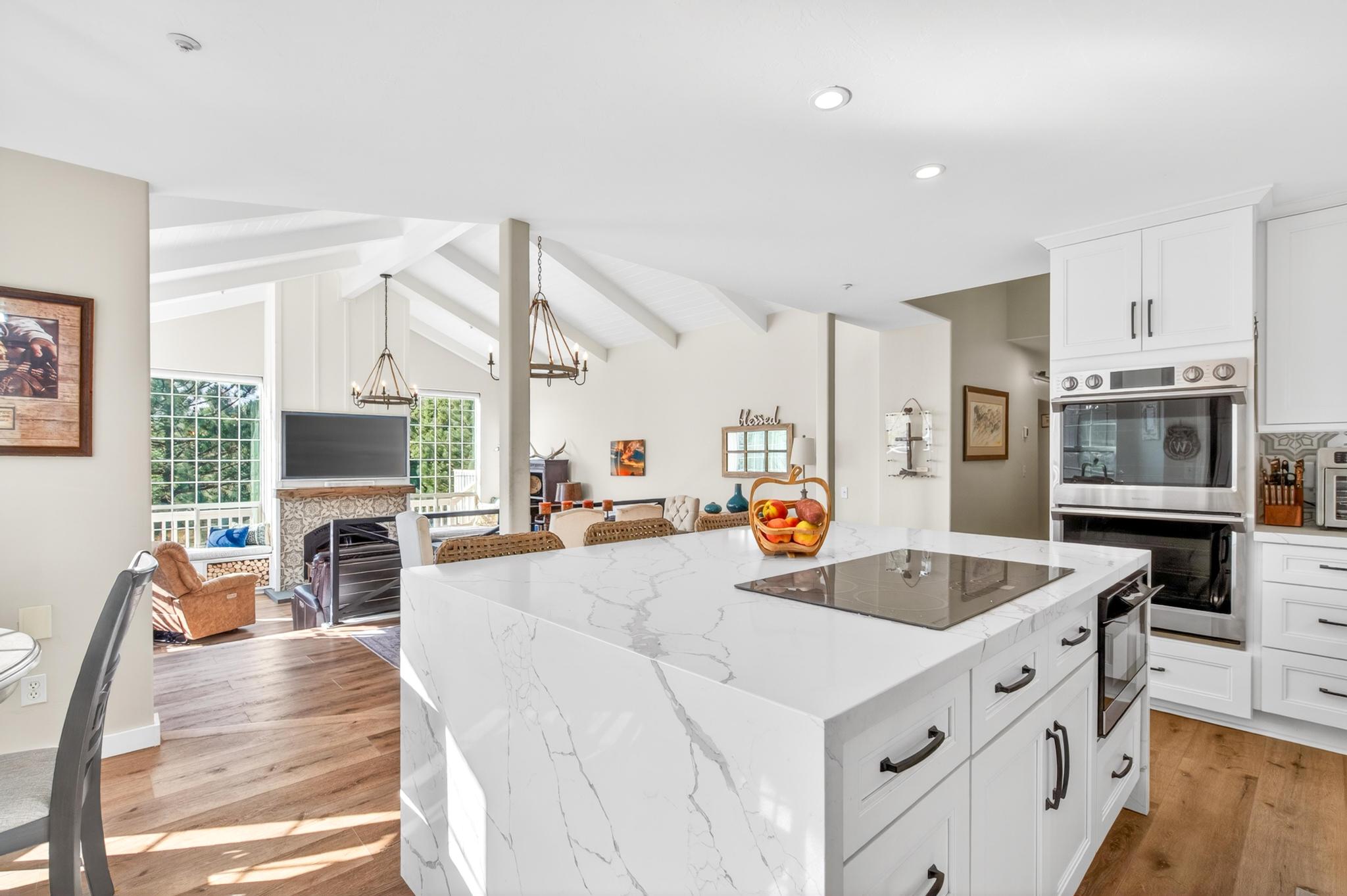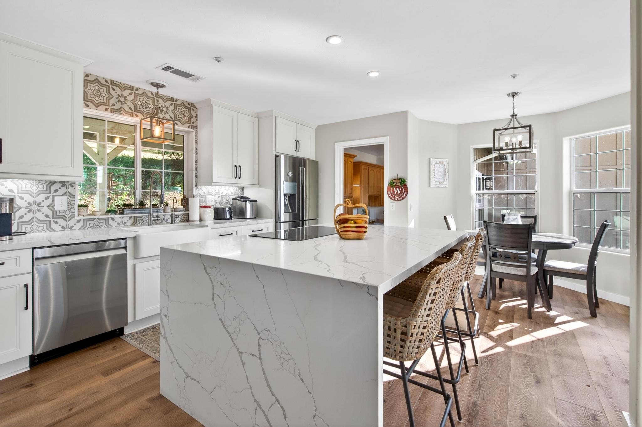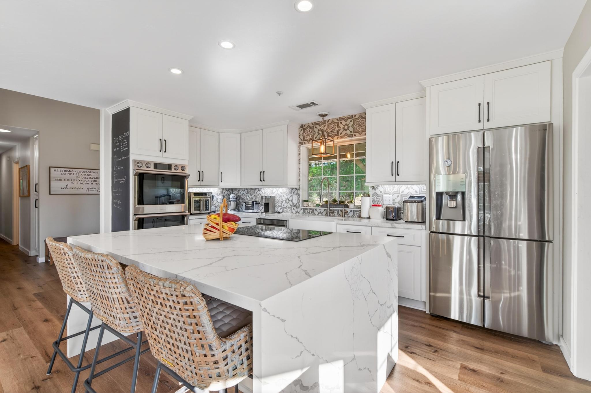 The kitchen serves as a true centerpiece, featuring stainless steel appliances, an induction cooktop, farmhouse sink, and an oversized island with striking double waterfall edges. A Dutch door leads to a spacious laundry and utility room with ample counter space, sink, and storage, conveniently connecting to the attached three-car garage. The home is equipped with a comprehensive water system, including triple filtration with a carbon filter, as well as reverse osmosis drinking water in the kitchen.