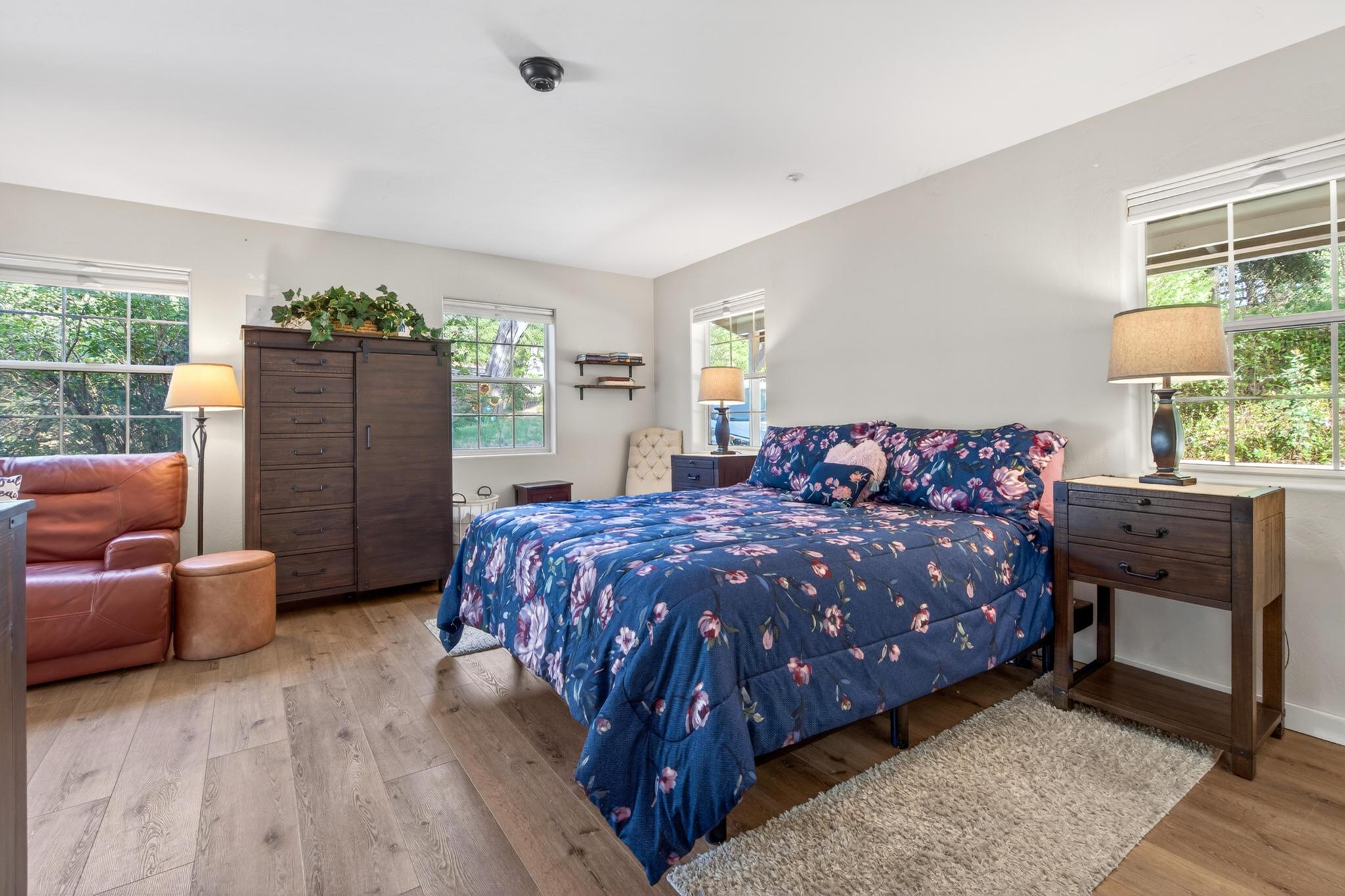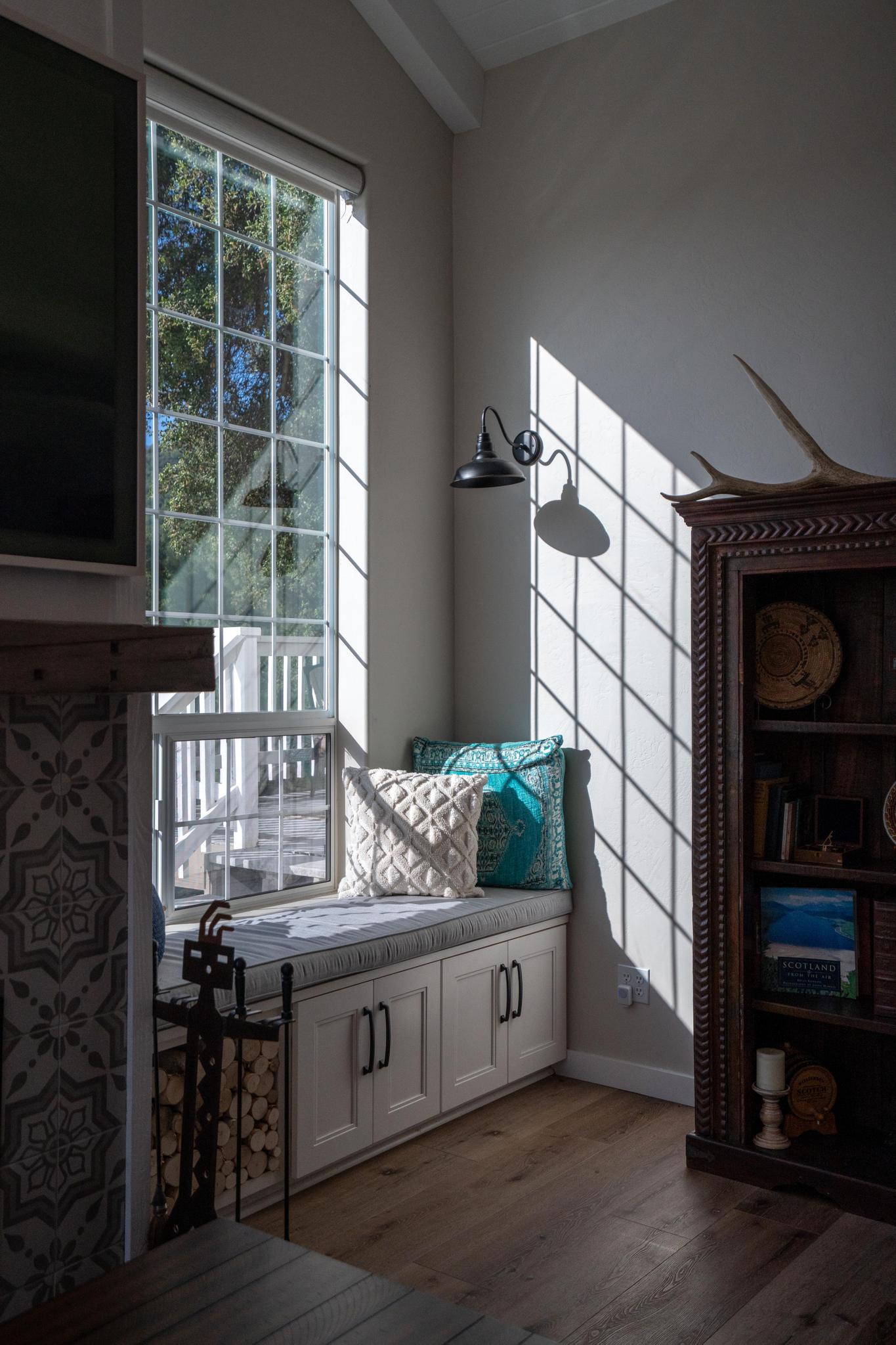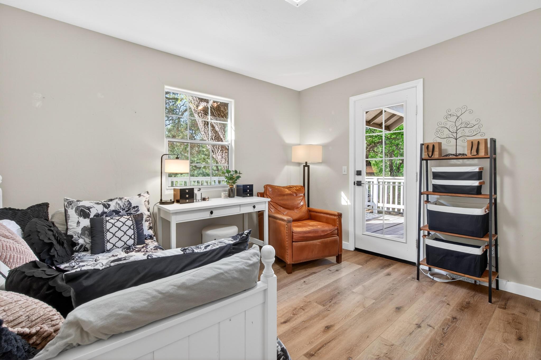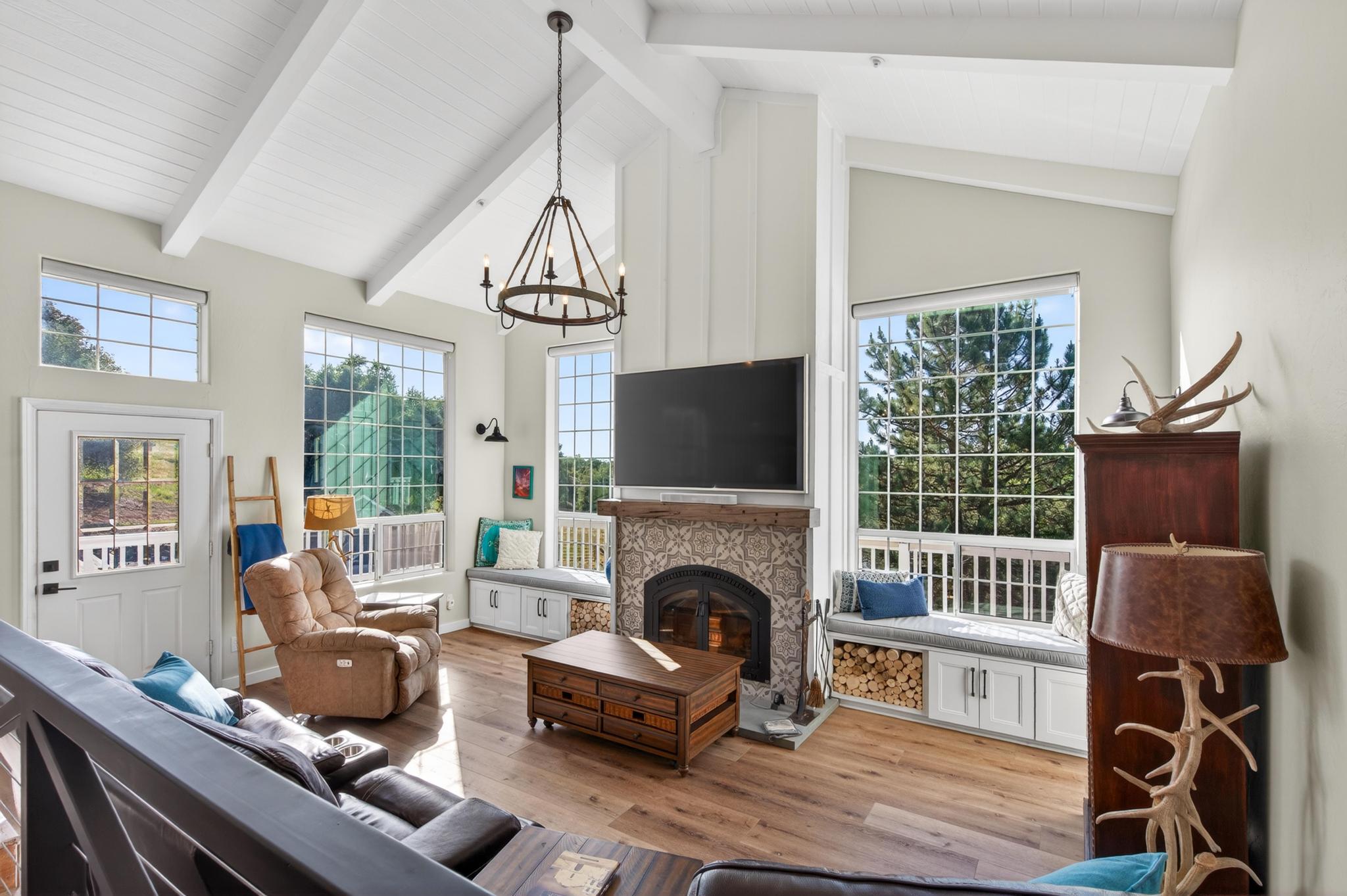 Living areas are anchored by a dramatic floor-to-ceiling stone fireplace enhanced with a catalytic converter for efficient heating, complemented by a custom concrete mantel and stone hearth. Window seats create inviting spaces to relax, while multiple living and dining areas offer flexibility for gatherings, guests, or creative use. The primary suite is filled with natural light and opens directly to the deck, where sunset views and the shade of a century-old oak provide a tranquil retreat.