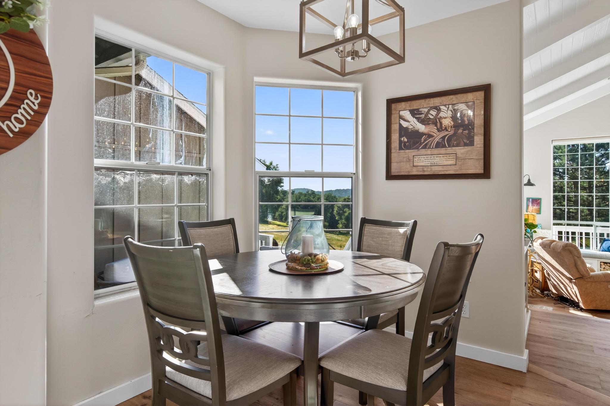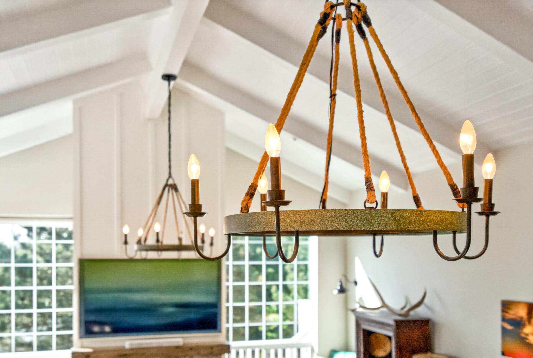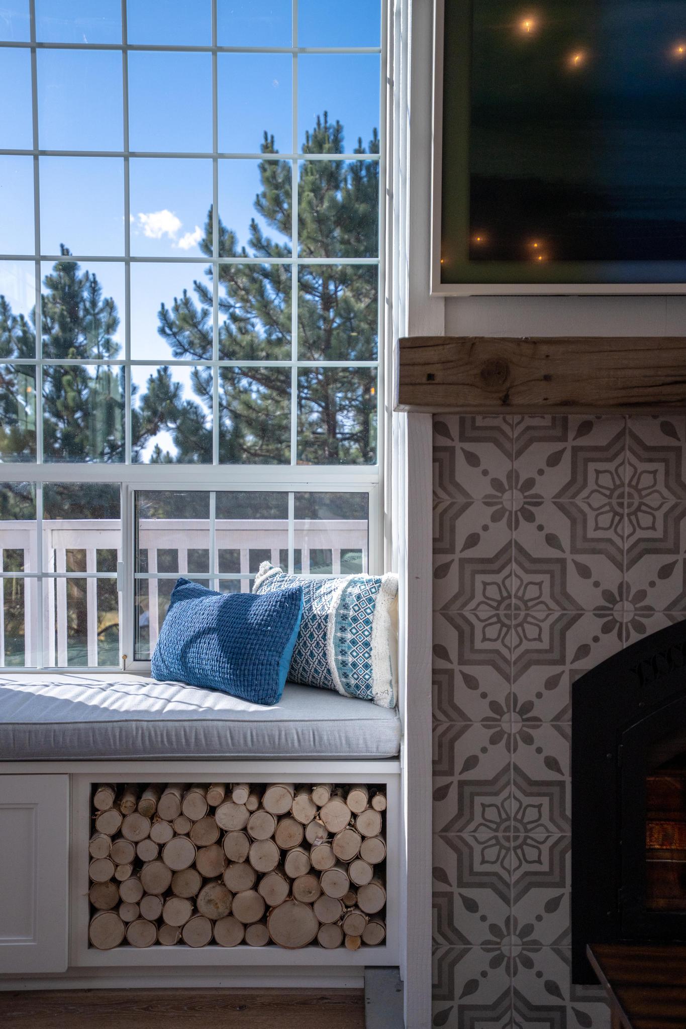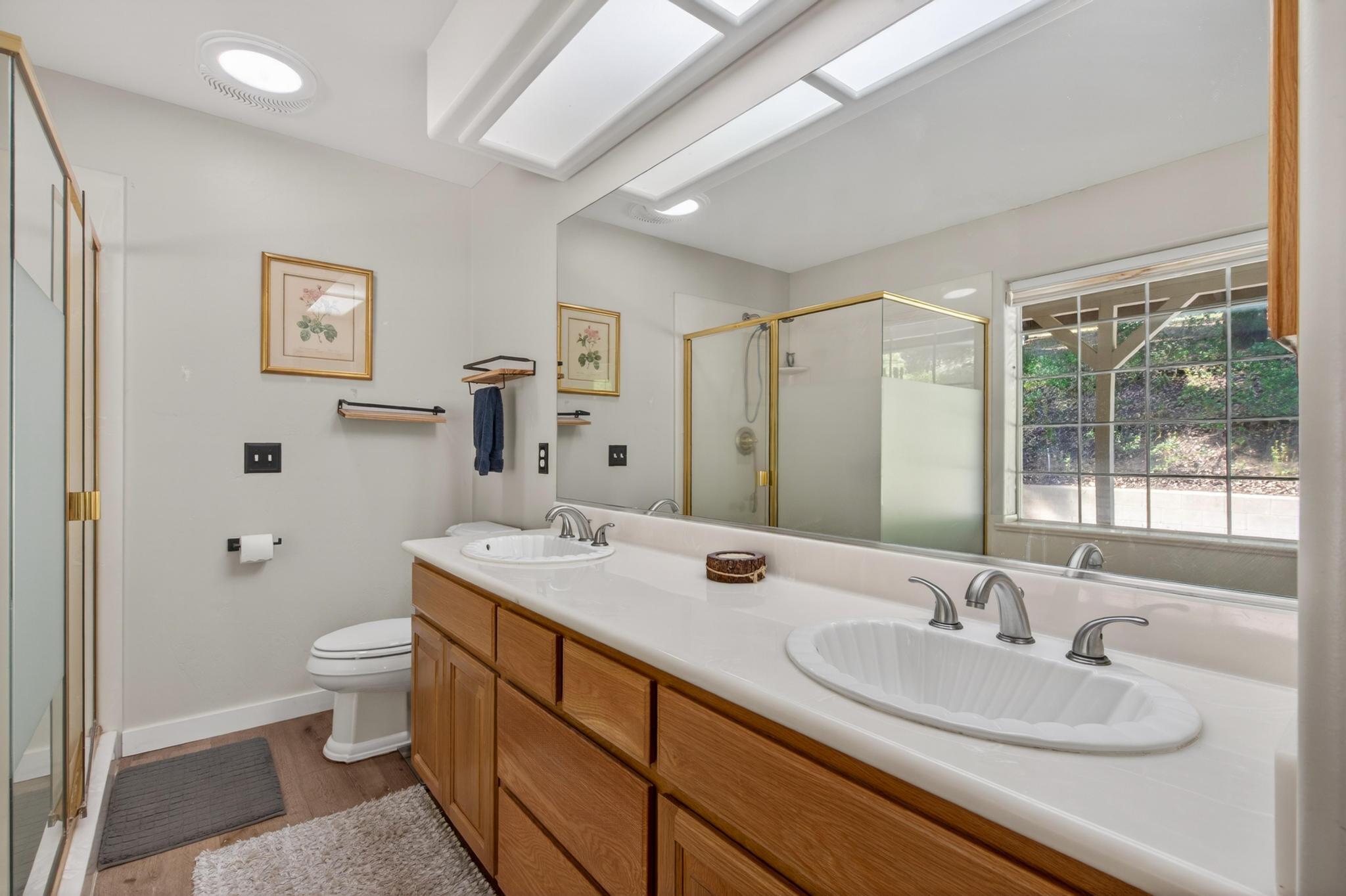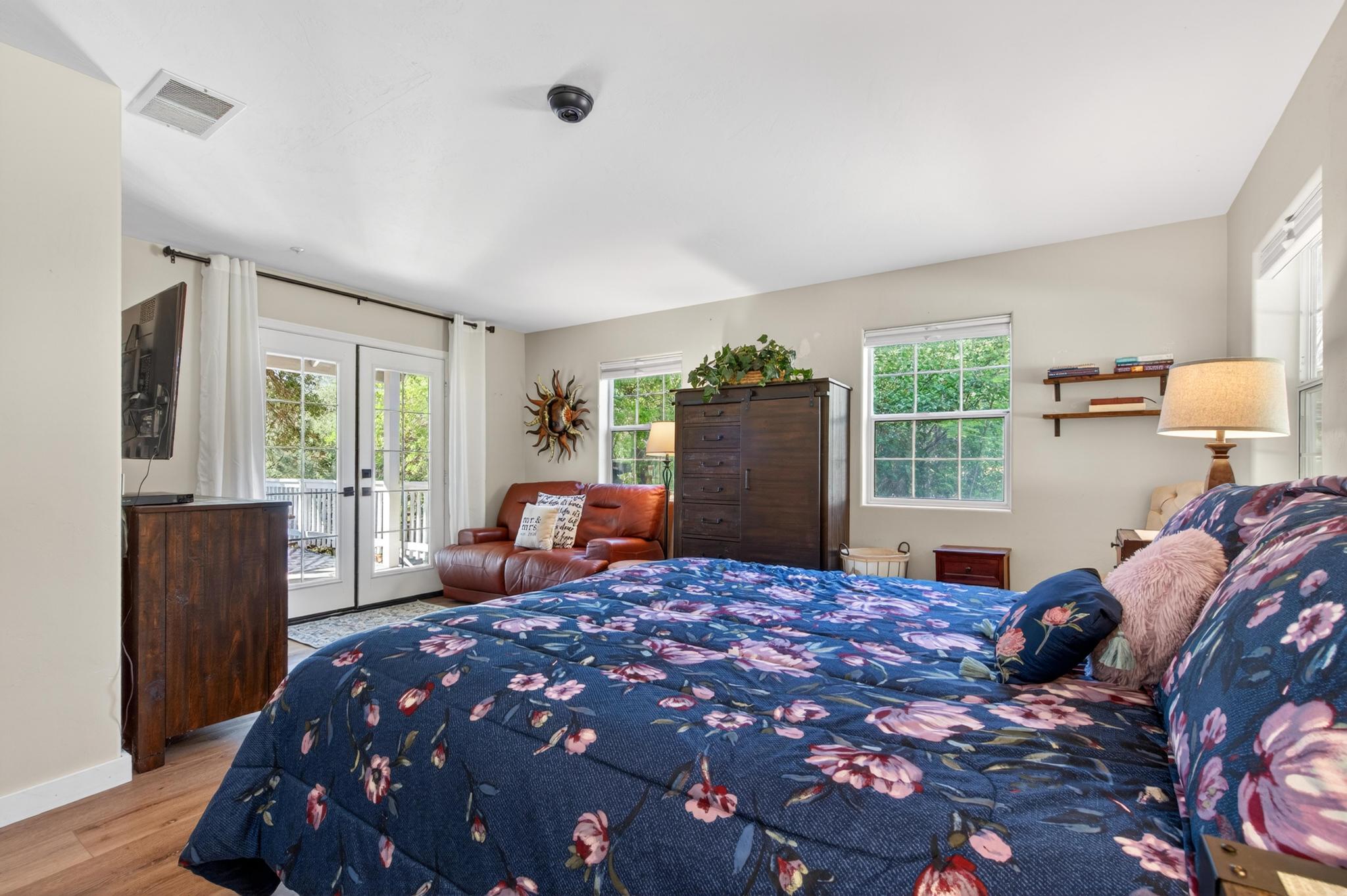 Living areas are anchored by a dramatic floor-to-ceiling stone fireplace enhanced with a catalytic converter for efficient heating, complemented by a custom concrete mantel and stone hearth. Window seats create inviting spaces to relax, while multiple living and dining areas offer flexibility for gatherings, guests, or creative use. The primary suite is filled with natural light and opens directly to the deck, where sunset views and the shade of a century-old oak provide a tranquil retreat.