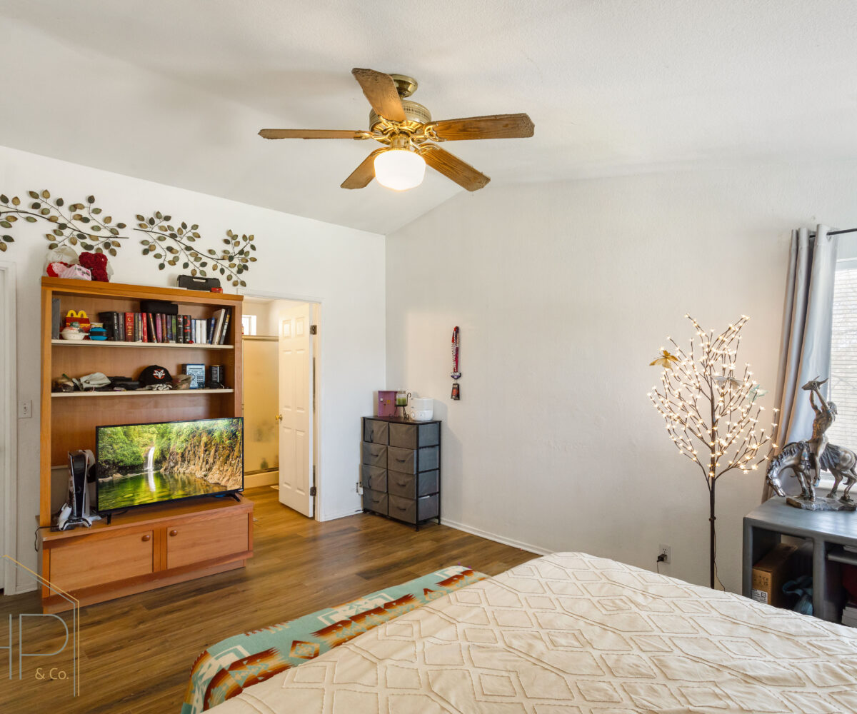 The home’s flexible layout includes a unique feature between the second and third bedrooms: double interior doors that allow for a versatile space, ideal for a home office, guest area, or creative studio. The spacious primary suite provides a private retreat, complete with an en-suite bathroom featuring a standing shower and a generously sized walk-in closet.